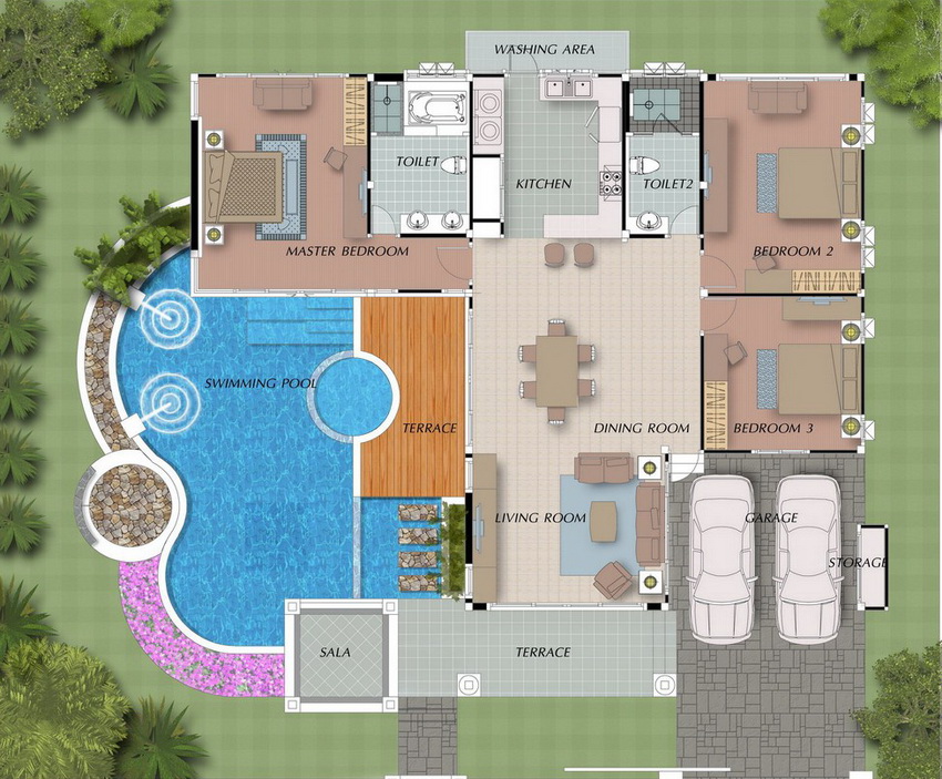 Большинство из них строятся на цокольном этаже, в котором модно оборудовать бассейн, дополнительный санузел или спальню, а также бильярдную.