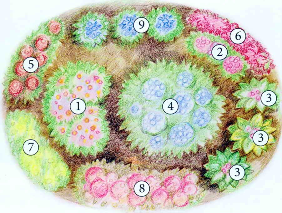 Любая схема клумбы имеет свой принцип. И тут следует учитывать не только сочетаемость растений, но и условия их содержания.