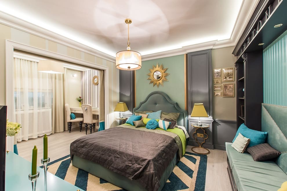 Зеленая палитра оттенков часто используется при создании уютной спальни. Она успокаивает, улучшает настроение, настраивает на позитив. Но нужно избегать темных оттенков или грамотно сочетать их со светлыми.