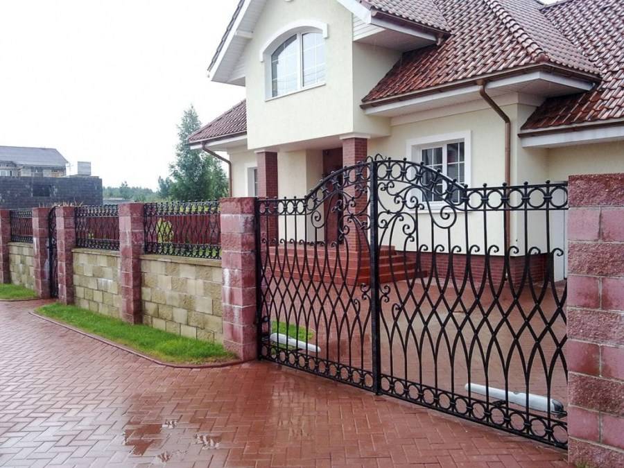 Кованые и литые ворота в сочетании с кирпичными заборами подчеркнут статус собственника.