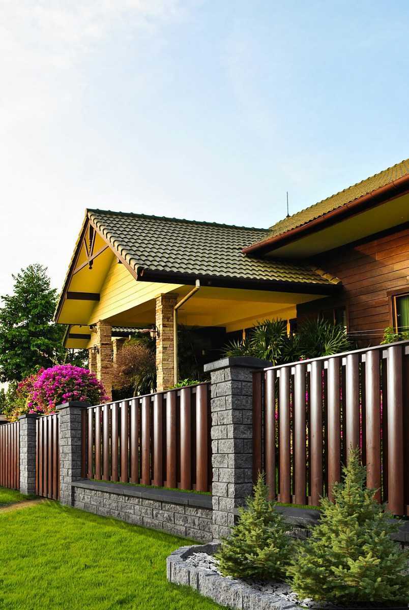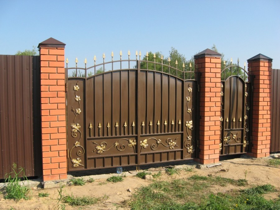 Кирпичные колонны, украшенные декоративными элементами, в сочетании с профнастилом имеют привлекательный вид. Такое дизайнерское решение подходит для частных домов.