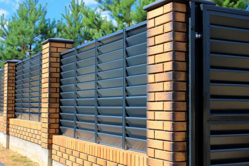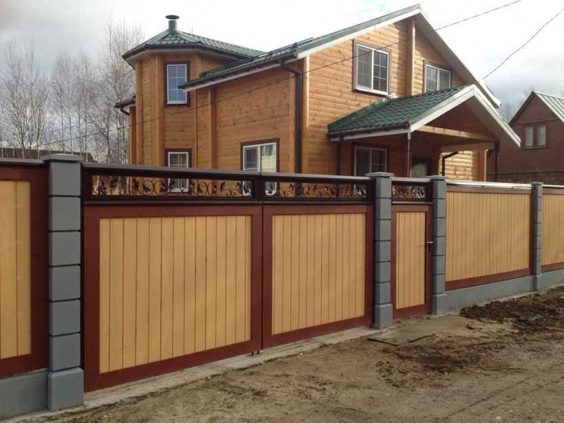 Такое ограждение получило широкое распространение, благодаря своему благородному внешнему виду. Между колоннами из кирпича располагаются секции из профнастила, который крепится на лаги из профильной трубы или уголок. Если пролеты между опорными столбами достаточно большие, появляется необходимость в монтаже дополнительных лаг, которые устанавливаются с тыльной стороны.