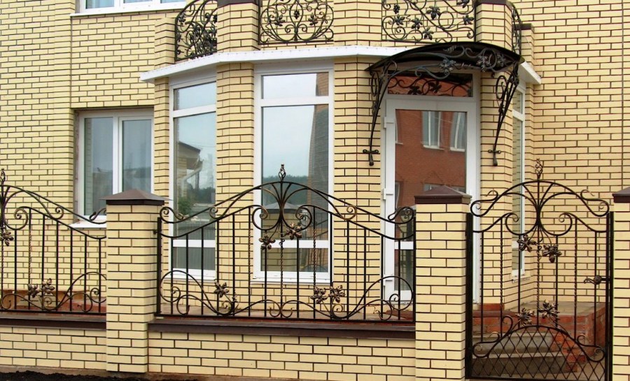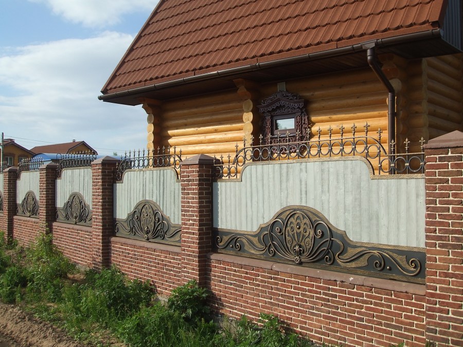 Имеют широкое распространение. Выполнить такой забор гораздо проще, чем заниматься художественной ковкой. Дело в том, что они создаются по стандартному шаблону. Здесь применяются как кованые элементы, так и кирпичные (или деревянные). Благодаря этому сокращается время, падает цена. В процессе работы заборной конструкции используют хомуты. Часто применяют скручивание или заклепки.