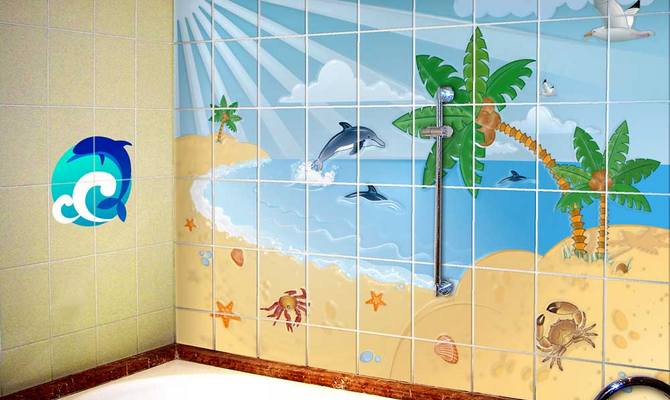 - Нанесение декора на кафельную поверхность позволяет дополнить дизайн некоторым красочным узором и даже изображением.