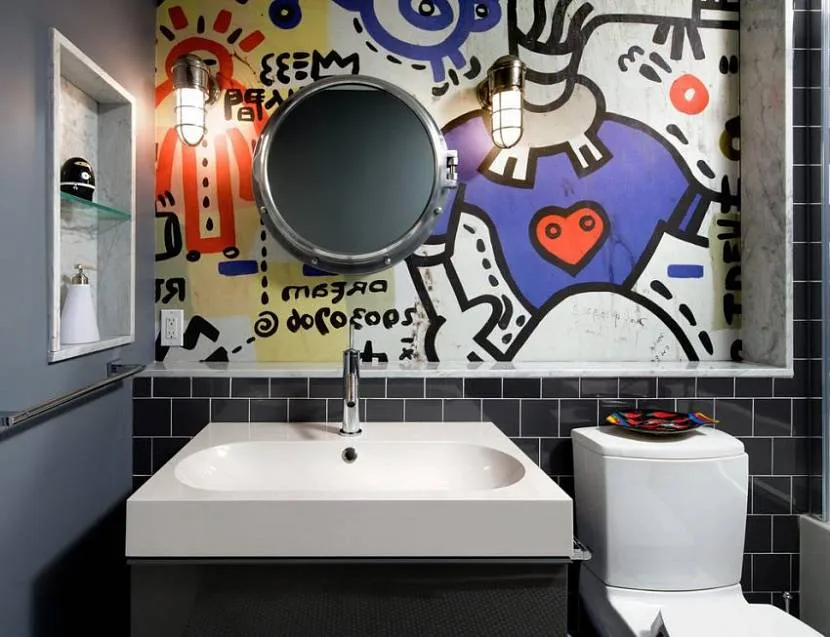 Яркие, необычные цвета на поверхностях стен отлично подойдут в интерьер стиля ванной комнаты в духе поп-арт или арт-деко. Оригинальность и изюминку принесут рисунки, позаимствованные из комиксов, или просто жизнерадостные картинки.