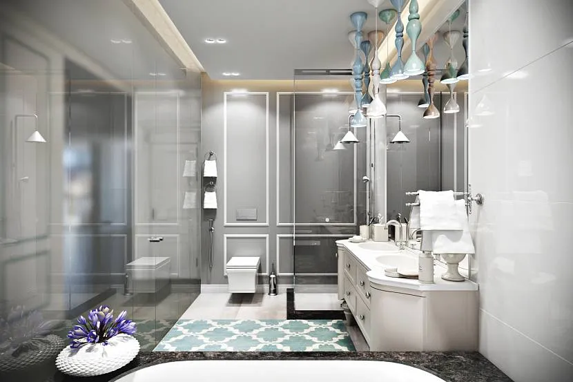 Популярные цвета для отделки стен: зеленый (бодрит, вселяет ощущение стабильности и уверенности), синий (ассоциируется с водой и действует успокаивающе, расслабляюще), белый (символизирует чистоту, хорошо сочетается с любыми оттенками). Модный тренд – покраска стен в ванной комнате и дизайн в серых тонах, что позволяет подбирать акценты любых цветов.