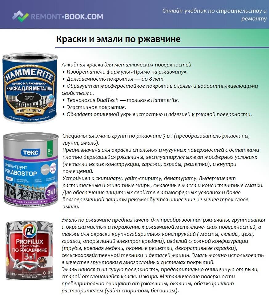 Особняком в этой классификации стоит многокомпонентная антикоррозионная краска по металлу и ржавчине. Такие составы содержат не только пигмент и пленкообразующую среду, но и вещества, способные преобразовывать слой ржавчины в грунт. Подобные краски 3 в 1 по ржавчине крайне удобны в применении и позволяют сократить срок проведения работ в разы.