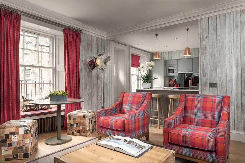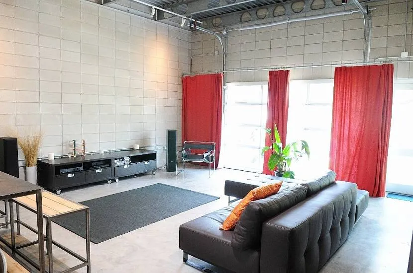 Гостиная в стиле лофт, совмещенная с кухней, украшена красными клетчатыми шторамиИсточник jaluzi-vertikal.ru