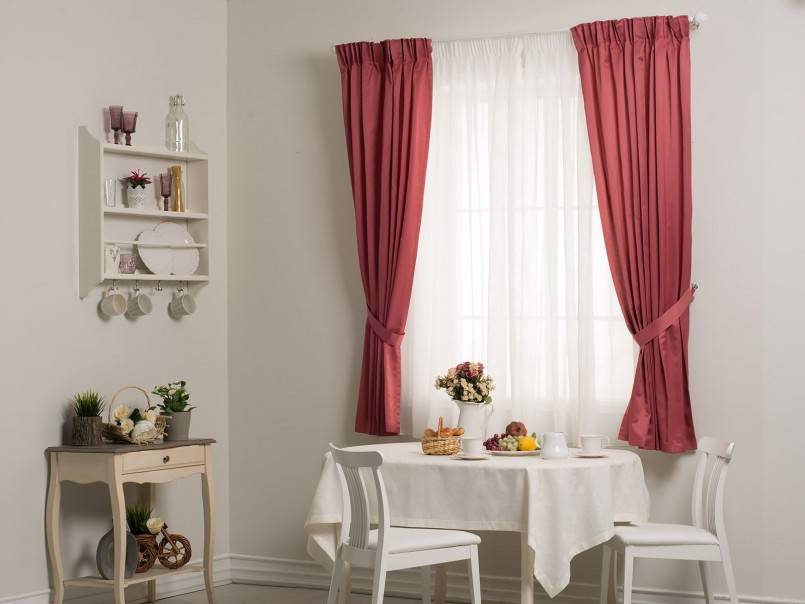 При создании красивого оформления окна в небольшом пространстве кухни или спальни, вместо тяжелых занавесок красного тона лучше повесить невесомый темно-красный тюль или нитяные шторы данного цвета.
