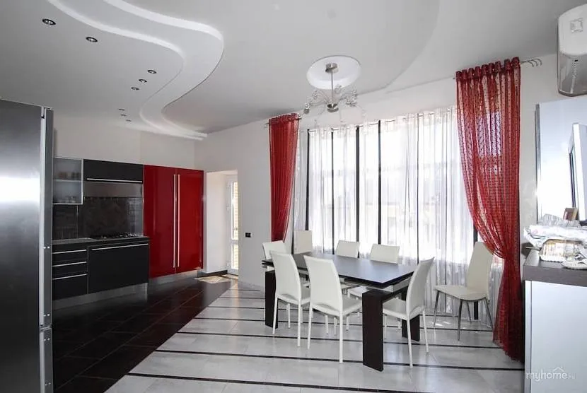Столовая-кухня в стиле хай-тек украшена белым тюлем и красными шторами из легкой тканиИсточник stroj-kontakt.ru