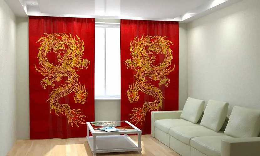 Комната в китайском стиле с характерными прямыми красными шторами с изображением золотого драконаИсточник berkem.ru