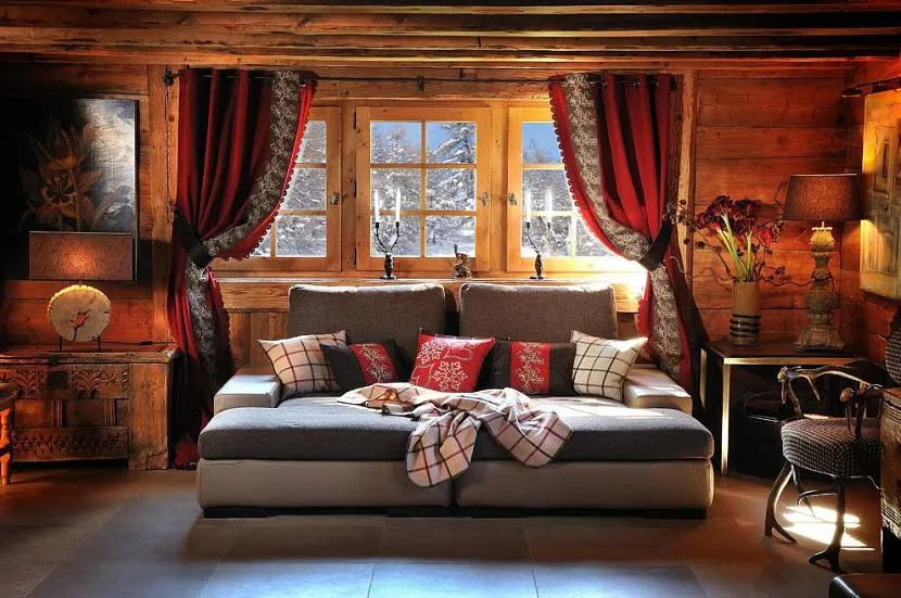 Гостиная в стиле шале с красными шторкамиИсточник homeandlivingdecor.com