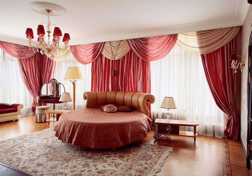 Под шторы красных оттенков для спальни, лучше выбирать светлые и однотонные обои. Роскошно будут смотреться обои светлые обои с золотым или красным орнаментом, фантазийным узором. Для особо смелых личностей не составит особого труда скомпоновать черно-красные шторы с голубыми или зелеными стенами, и смотреться это будет очень даже не плохо.