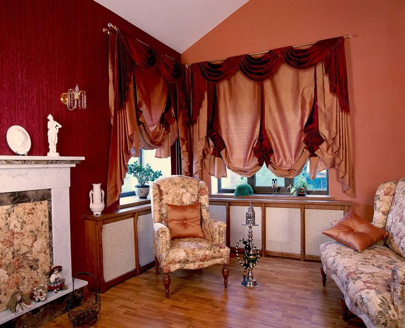 Гостиная в классическом стиле с красно-оранжевыми портьерамиИсточник mab.by