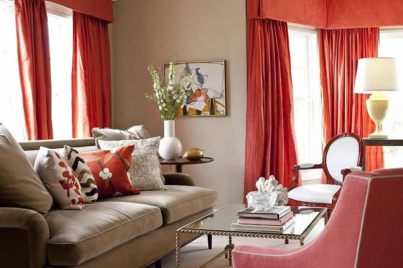 Оформление окон в гостиной или зале темно-оранжевыми шторами будет уместно при общем бежевом фоне. Стены могут иметь различные оттенки бежевого — от самого светлого и до темных оттенков.
