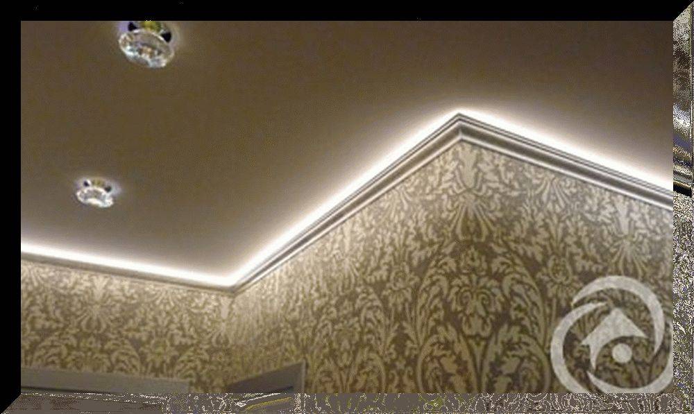 - В отдельных проектах по дизайну помещений присутствуют многоуровневые потолочные системы с декоративной подсветкой. Это предполагает монтаж по периметру комнаты металлического профильного каркаса, в последующем обшиваемого гипсокартонными плитами. В качестве верхнего базового основания в таком случае часто применяют натяжные полотна, для фиксации которых используется зажимной профиль. Его крепят поверх установленного вдоль всех стен специального короба из гипсокартона.