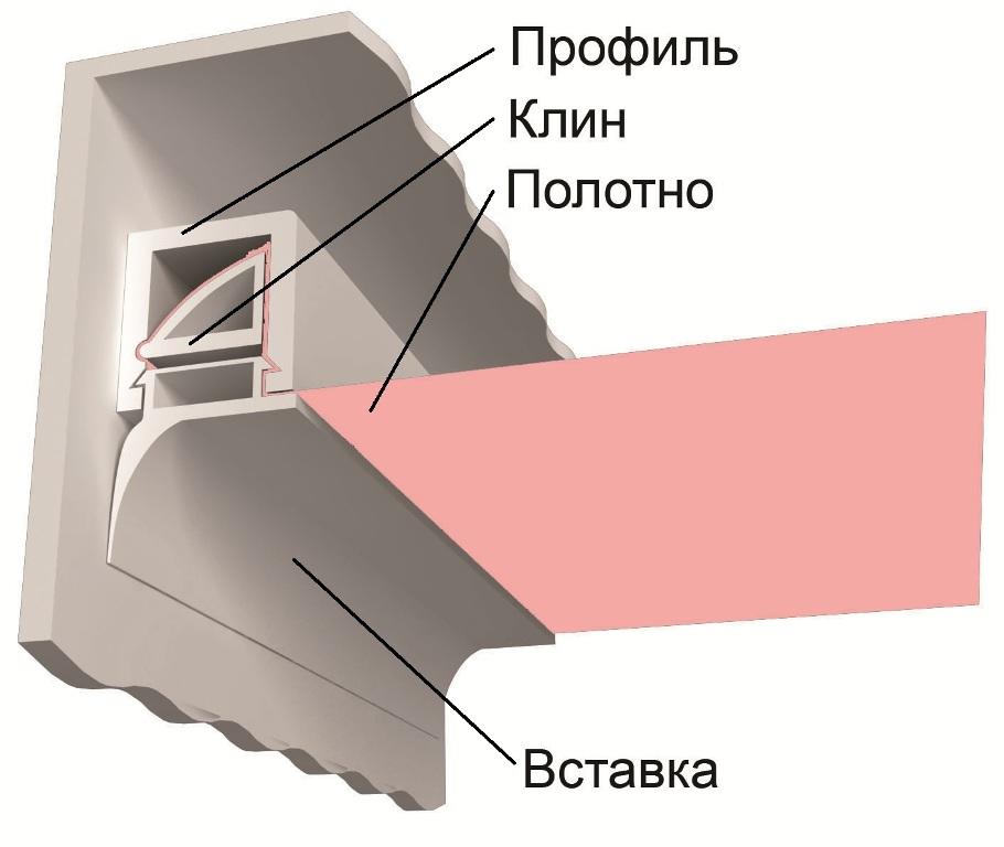 В работе используется П-образный профиль, выполненный из алюминия. Чтобы зафиксировать полотно, — необходимо вбить клин в паз этого профиля. После завершения монтажа между стеной и потолочным полотном остается зазор, скрыть который поможет потолочный плинтус (багет).
