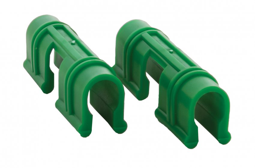 Этот вид крепления используется в случае, если каркас изготовлен из ПВХ труб и арматуры. Он позволяет прочно зафиксировать плёнку без гвоздей. Зажимы приобретаются в магазине либо изготавливаются самостоятельно. Для этого пластиковую трубу нарезают на кусочки любой длины (5–20 см).
