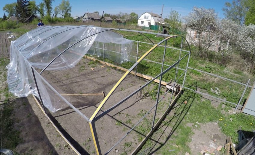 К укладке плёнки приступайте сразу, когда каркас установлен и закреплён в грунте. Выбирайте сухой и тёплый день без сильного ветра. Натянутая в холодный период плёнка после повышения температуры провиснет. Если работать в жару, то ближайшей ночью материал может порваться.