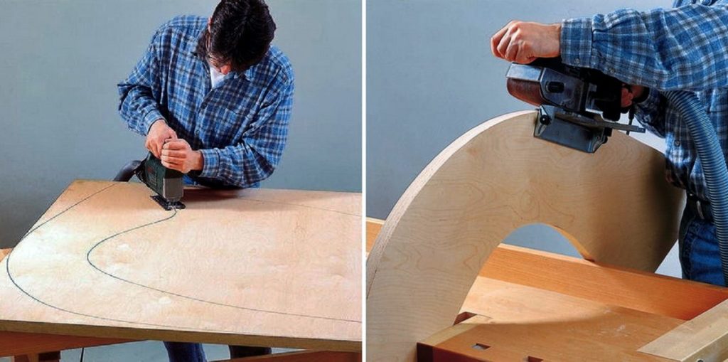 Для начала по шаблону расчертим 2 боковины кресла и аккуратно выпилим их по разметкам электролобзиком.
