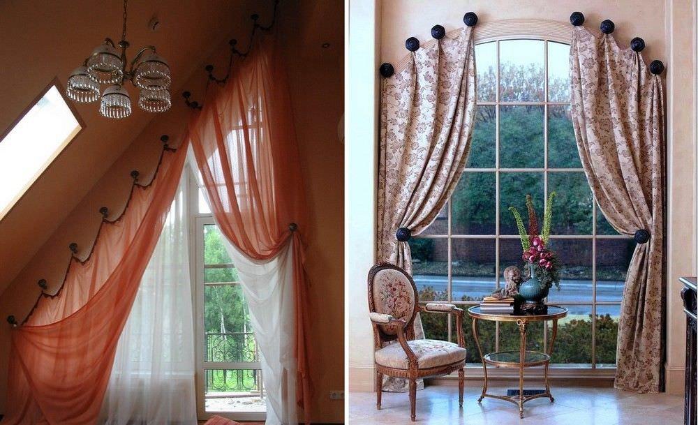 Очень экстравагантно выглядят тканевые полотна, подвешенные на декоративные крючки для штор, прикрепленные прямо к стене. Чаще всего такой вариант используют при декорировании арок или окон с закругленным верхом. Ткань выбираю тяжелую, которая будет красиво ложиться складками между креплениями, создавая эффект водопада.