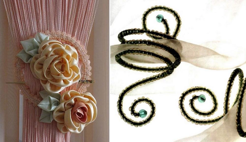 В качестве основы можно использовать классические держатели или подхваты для штор, изготовленные своими руками из атласной ткани, как показано в предыдущем примере. О том, как сделать розы, указано ниже: