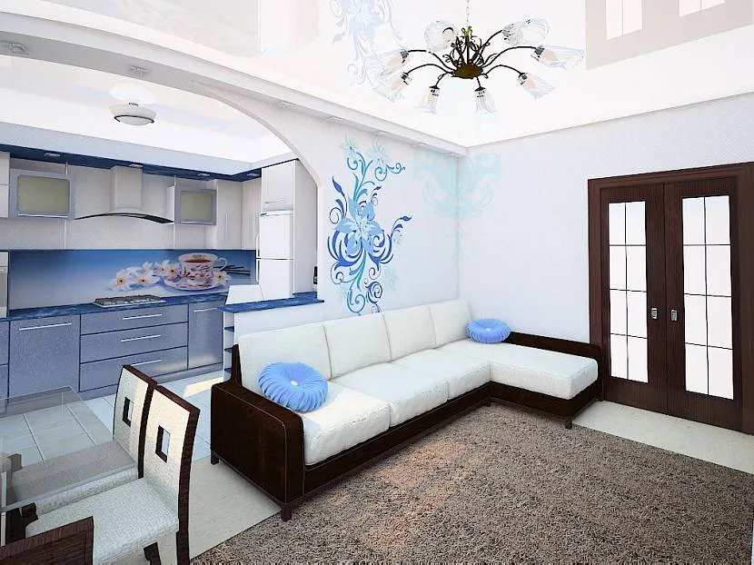 - контрастные тона в оформлении стен: кухня в яркой гамме, а гостиная – в спокойной, или наоборот;