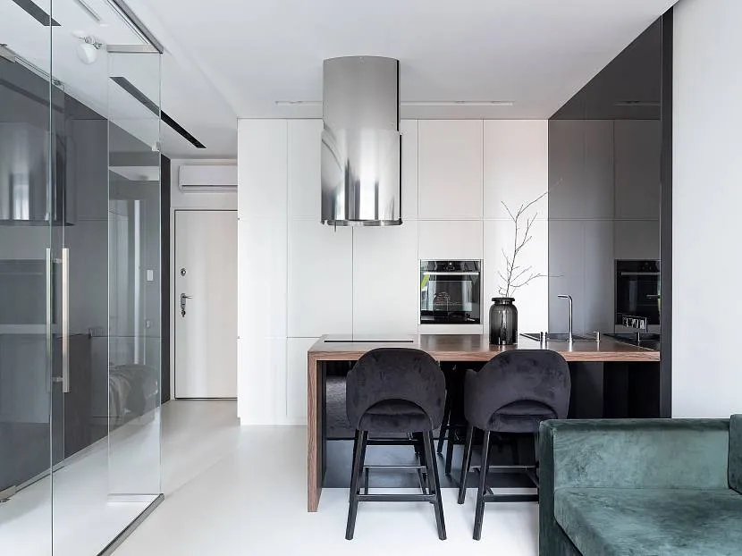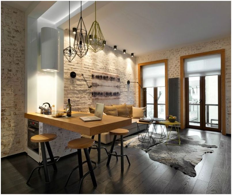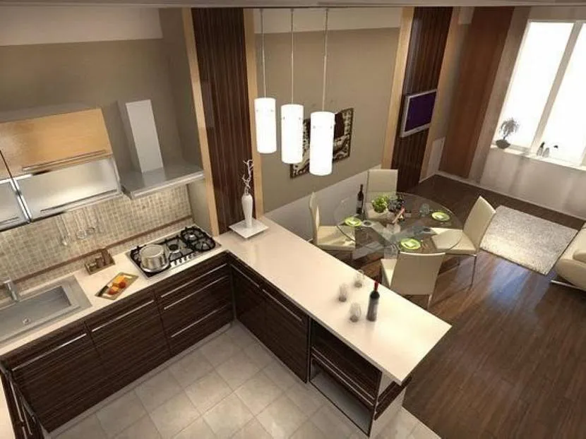 Барная стойка отлично зонирует пространство и подойдет к любому дизайну кухни-гостиной на 25 кв