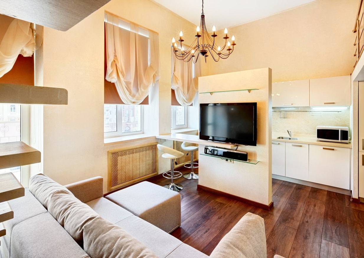 Зонирование разделяет кухню и гостиную несмотря на отсутствие стены, но одновременно визуально расширяет пространство небольшой комнаты площадью 25 квадратных метров.