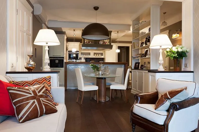 Выбирая стиль оформления, стоит придерживаться определенных канонов. Тогда пространство будет гармоничным, несмотря на то что совмещенная кухня-гостиная разделена на зоны с разными функциями. Интерьер может быть таким: