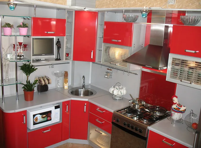 Не всякая мебель подойдет для маленькой кухни. Лучше всего остановить свой выбор на угловом кухонном гарнитуре. Радиусная мебель – самый оптимальный вариант для небольшой кухни.