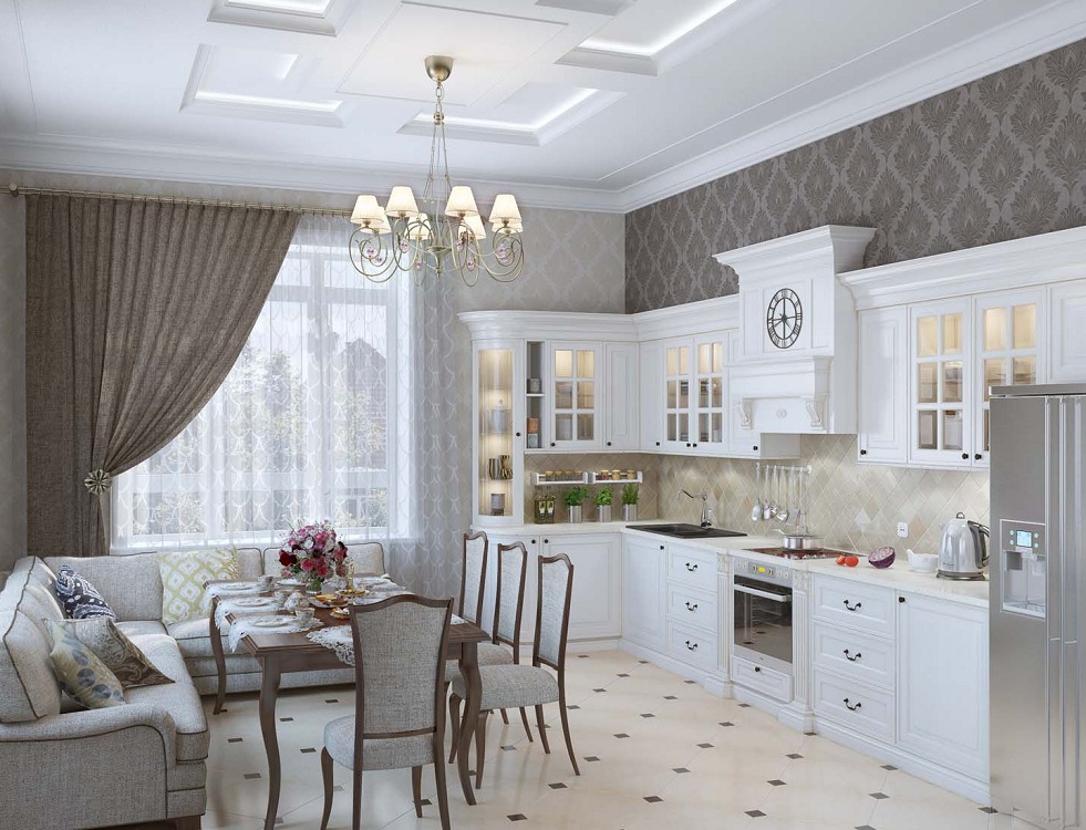 Стили, которые выбирают для оформления больших кухонь, выделяются элегантностью и наличием разнообразных архитектурных элементов – лепнины, колонн, роскошных люстр или декоративных карнизов. Для тех, кто предпочитает современные стили, подойдет лаконичный гарнитур, открытые полки и авторский декор.