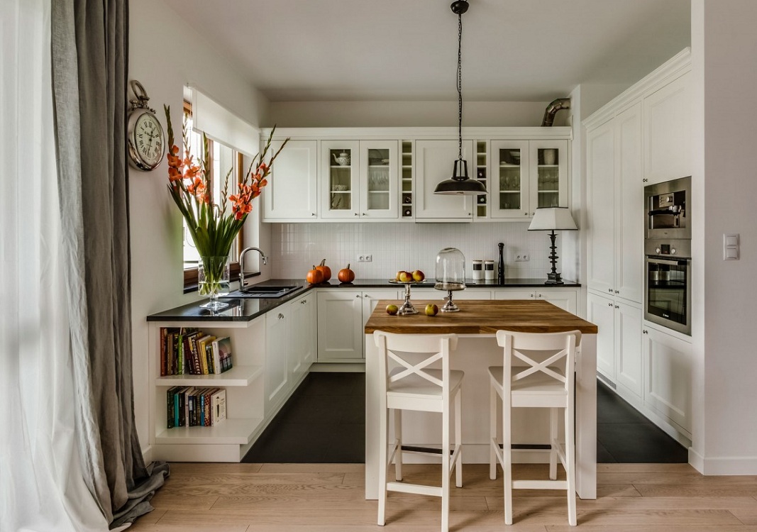 Особое внимание следует уделить выбору и размещению мебели. Кухонные шкафы со светлыми, гладкими фасадами будут лучшими. Высокие конструкции обеспечат большой объем складских помещений, а открытые полки придадут легкость