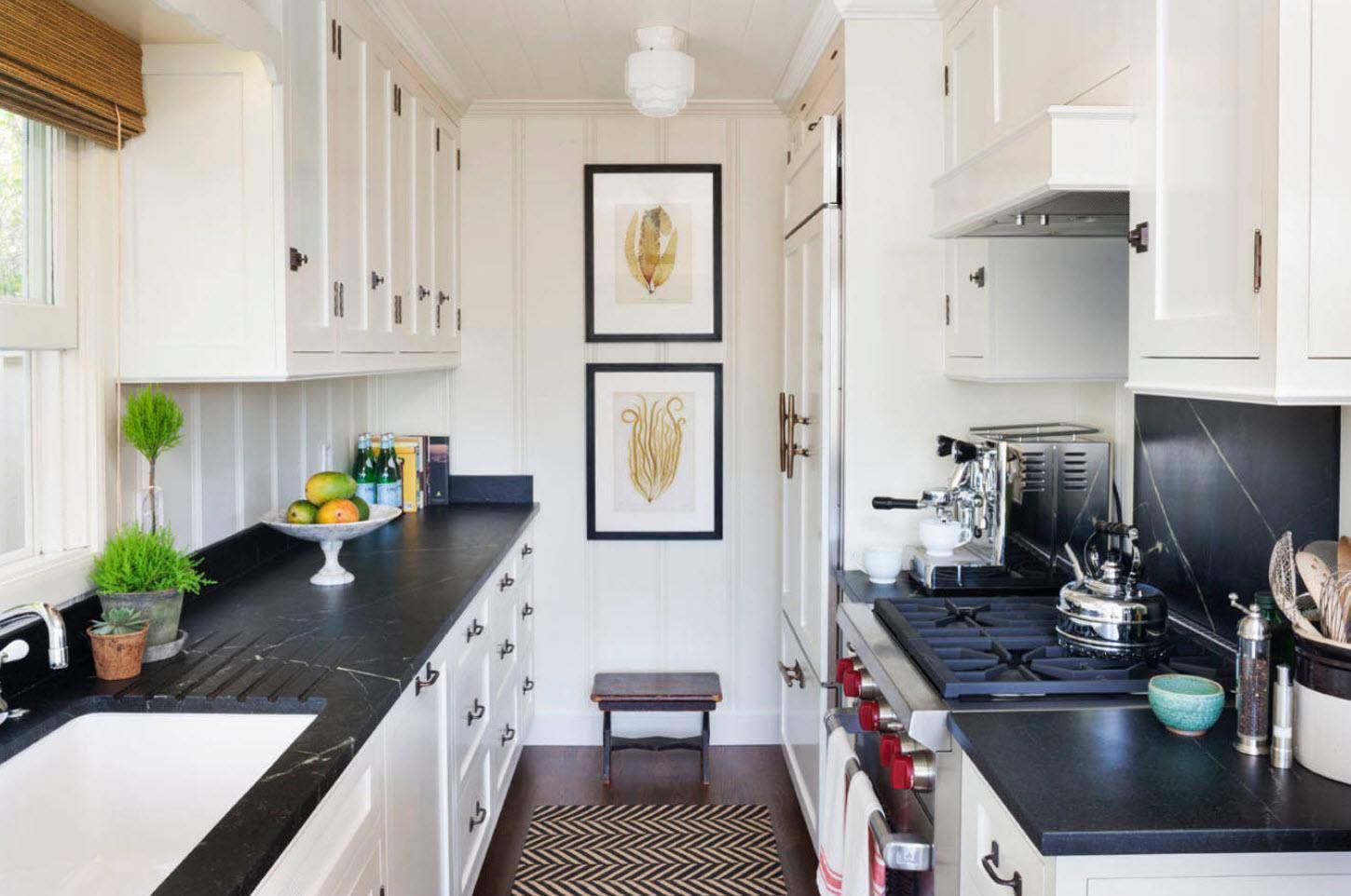 У противоположной стены устанавливают холодильник, стол, здесь же располагается плита, рабочая поверхность. Мойку или варочную панель можно разместить у короткой стены или в углу.