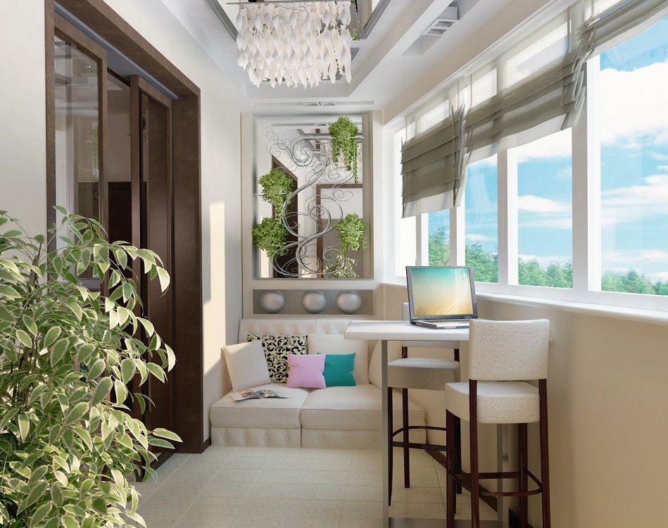 Выбор мебели обязательно нужно соотносить с функциональными возможностями лоджии или балкона, учитывать изношенность несущих конструкций. Хорошее решение для балконного пространства — использование нетяжёлой мебели, предметов-трансформеров, откидных полок и столиков. Высокие барные стулья можно разместить вдоль оконных рам.