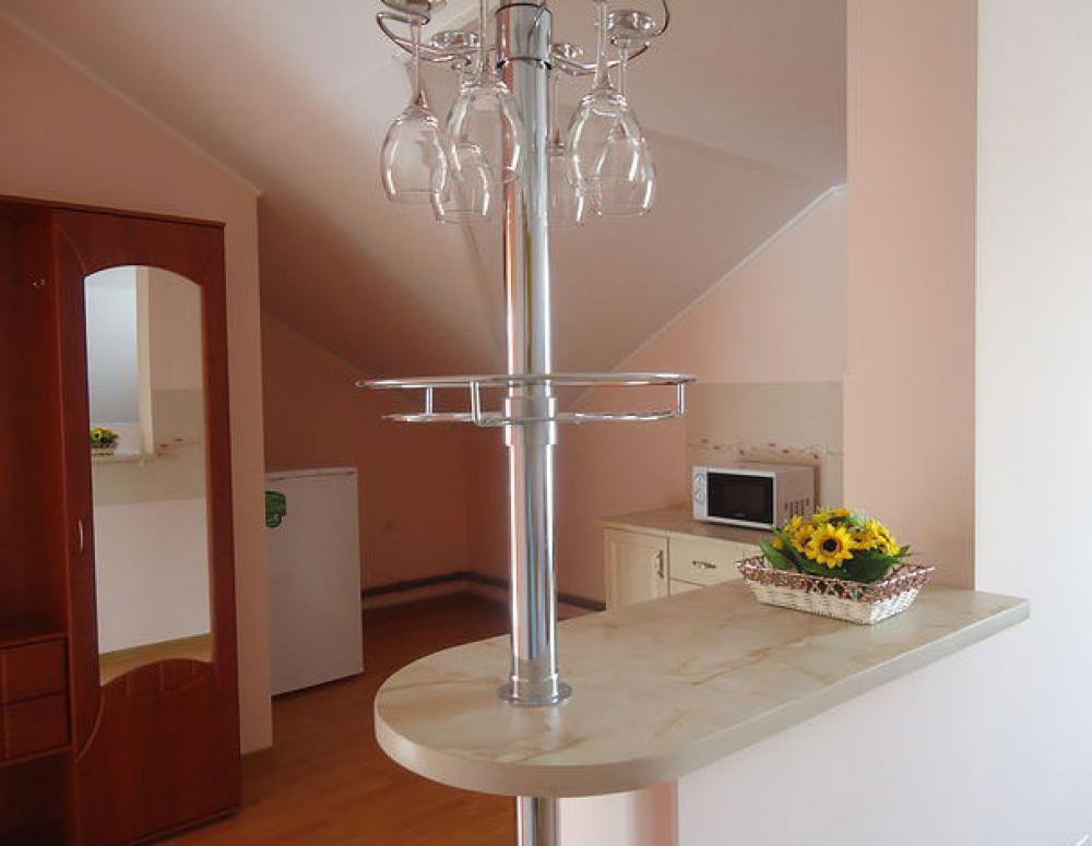 - Барную стойку. Этот вариант может понравиться тем, что барная стойка может быть использована и как небольшой обеденный стол, позволяющий членам семьи устроить незапланированный перекус. Над барной стойкой легко расположить полки, которые пригодятся для хранения кухонной посуды, сувениров или фотографий;