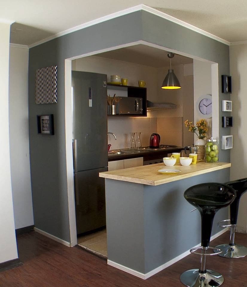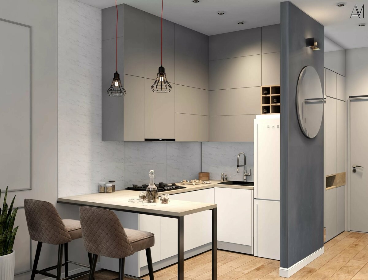 Если дома вы только ночуете и завтракаете, не приглашаете много гостей, то вам не нужен огромные обеденный стол и бытовая техника. Барная стойка вместо стола, плита на 2 конфорки и хотя бы 60-80 см рабочей поверхности столешницы.