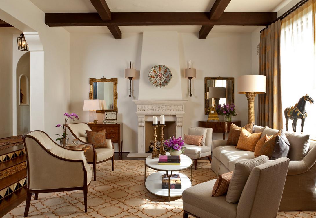 - отлично в таком интерьере смотрится камин, арочные окна и двери.