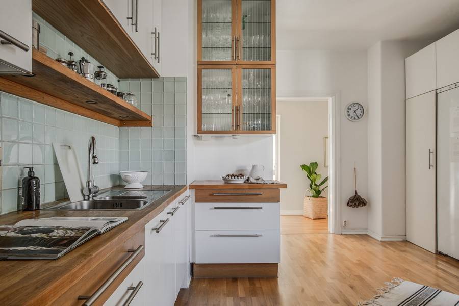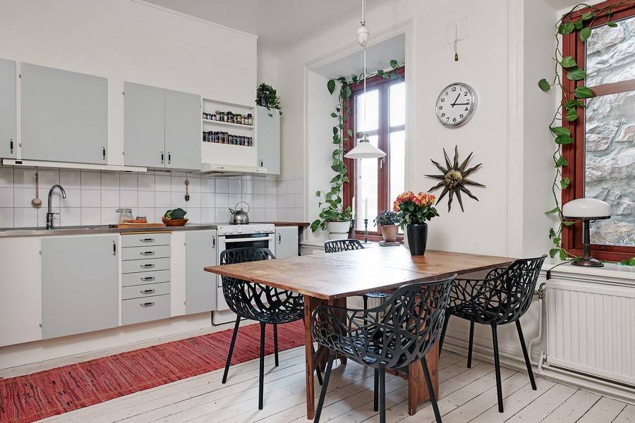 Тем, кто ностальгирует по СССР, подойдет идея оформления в стиле 60-х. Обои с ярким узором, разномастная мебель вместо кухонного гарнитура, линолеум, керамический фартук в рабочей зоне, подвесной светильник с крупным плафоном. Изюминкой интерьера станет застекленный шкаф-буфет для хранения посуды.