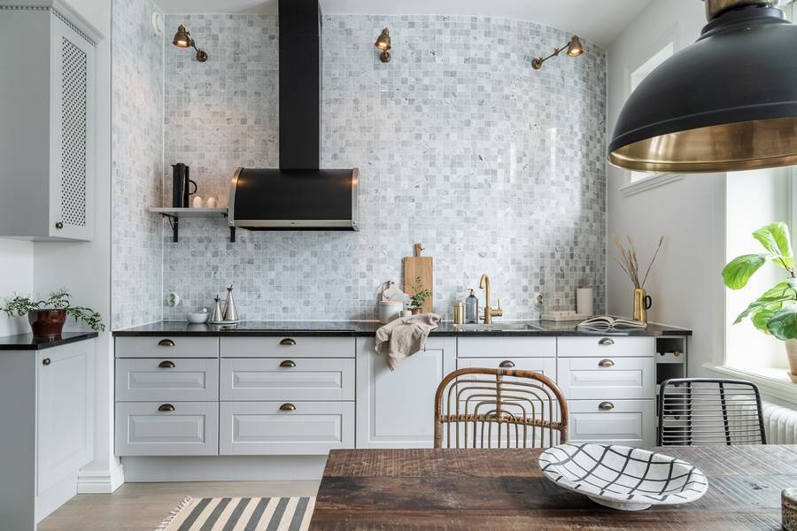 - Цвета и фактуры контрастируют между собой. Например, зеркально гладкая столешница из мрамора составит контраст небрежно оштукатуренной стене.