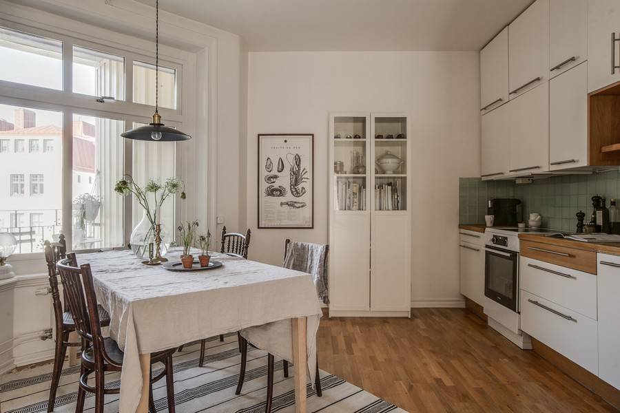 большие предметы обстановки и габаритная меблировка. Установите в помещении массивный кухонный гарнитур, стол, имеющий грубую фактуру или нечеткую форму, старый буфет либо шкаф для размещения посуды;