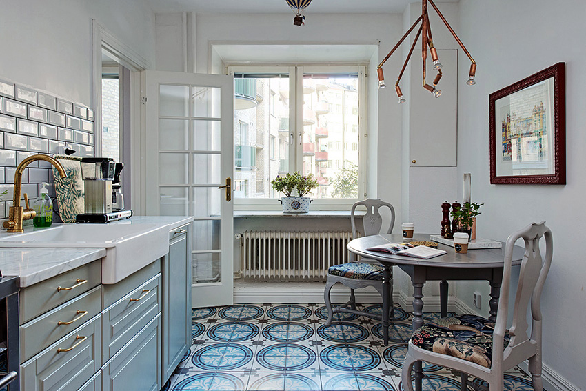 Отличным акцентом на маленькой кухне в скандинавском стиле может стать хрустальная люстра небольших размеров, которая позволит эффективно рассеивать и преломлять свет. Именно восполнение недостающего света, характерное для северных стран, помогает визуально расширить пространство в небольших помещениях. Зрительному увеличению площади также способствуют преобладание белого цвета и наличие разных источников искусственного освещения.