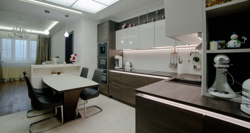 Как было сказано выше, специалисты зачастую выбирают современный дизайн для совмещённых помещений, а именно для оформления кухни-студии