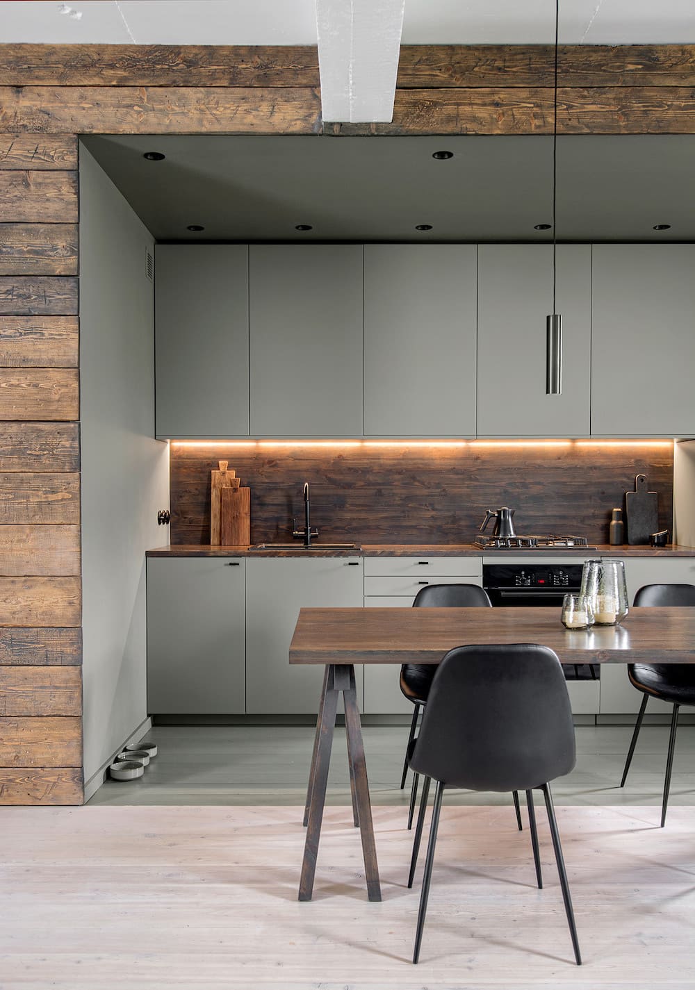 Абсолютное табу для скандинавского стиля — дорогие роскошные украшения, яркие краски и позолота. Сканди — это изящество и кажущаяся небрежность. В интерьере кухни подобная «неидеальность» очень практична: даже небольшой беспорядок, создаваемый во время готовки, не портит обстановку.