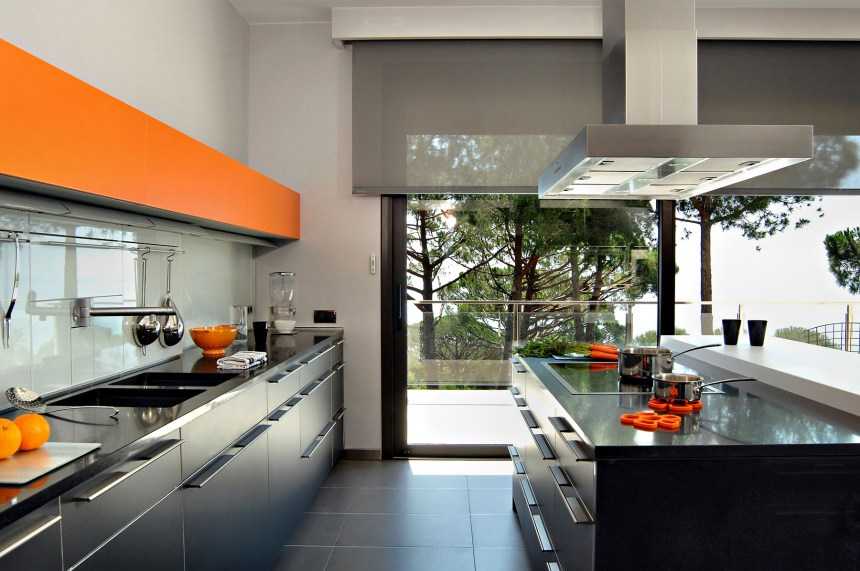 В современном интерьере актуальной станет планировка с островом (если площадь позволяет) или барной стойкой, тем более что сложно найти хороший обеденный стол, подходящий для хай-тек