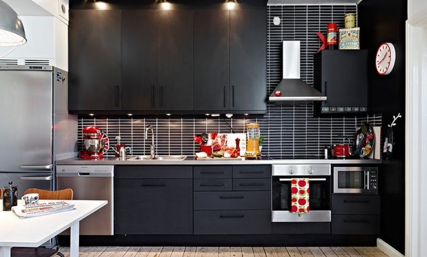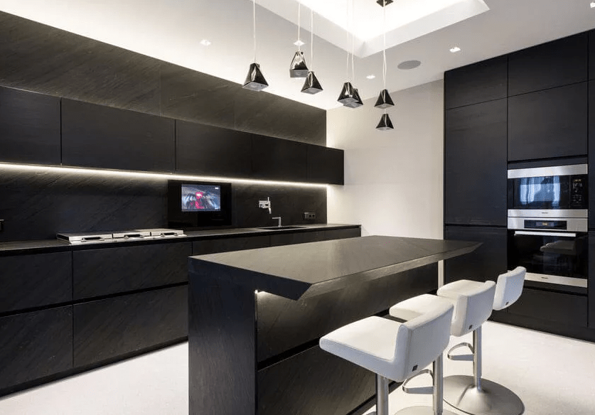 Зачастую вместе с потолком устанавливают встраиваемую подсветку, которая находится на границе черных и белых панелей. Такой потолок разделит пространство на рабочую и обеденную зоны. Разбавит черно-белую конструкцию яркий кухонный фартук или лаконичный декор.