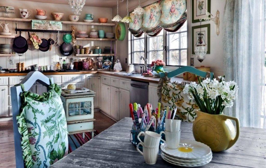 Завершат образ аксессуары в бабушкином стиле или hand-made. Для кухни подходит большое количество посуды: керамические тарелки, вазы, металлические сковородки, медные подносы и т. п. Их расставляют по всей комнате. Полочки и стол украсят глиняные фигурки и статуэтки в народном стиле, плетеные корзинки и баночки в стиле декупаж. Если позволяет пространство, то в кухне можно установить кресло-качалку, сундук и прочую “чердачную” мебель.