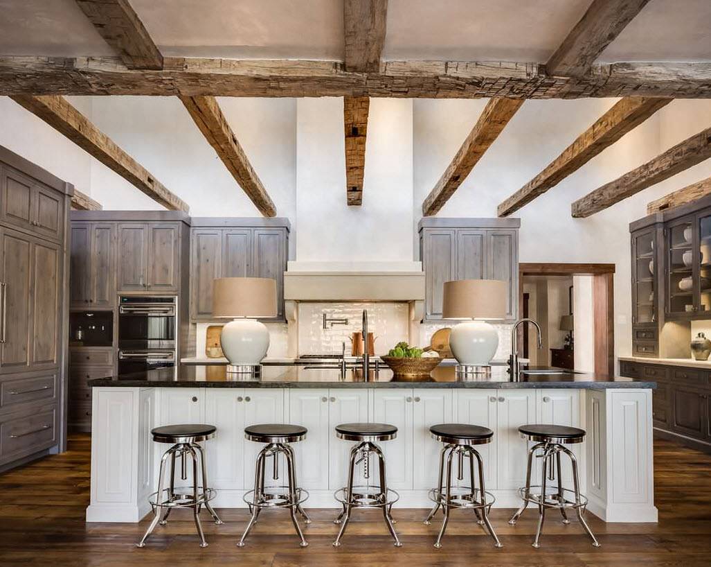 Классический, белый, матовый потолок – оптимальное решение для стиля кантри на кухне. Подчеркнуть аутентичность обстановки помогут деревянные балки или их имитация, уместны они в частном доме или в квартире с потолками выше 3 м. В частном доме потолок из бревен или вагонки подчеркнет деревенскую атмосферу.
