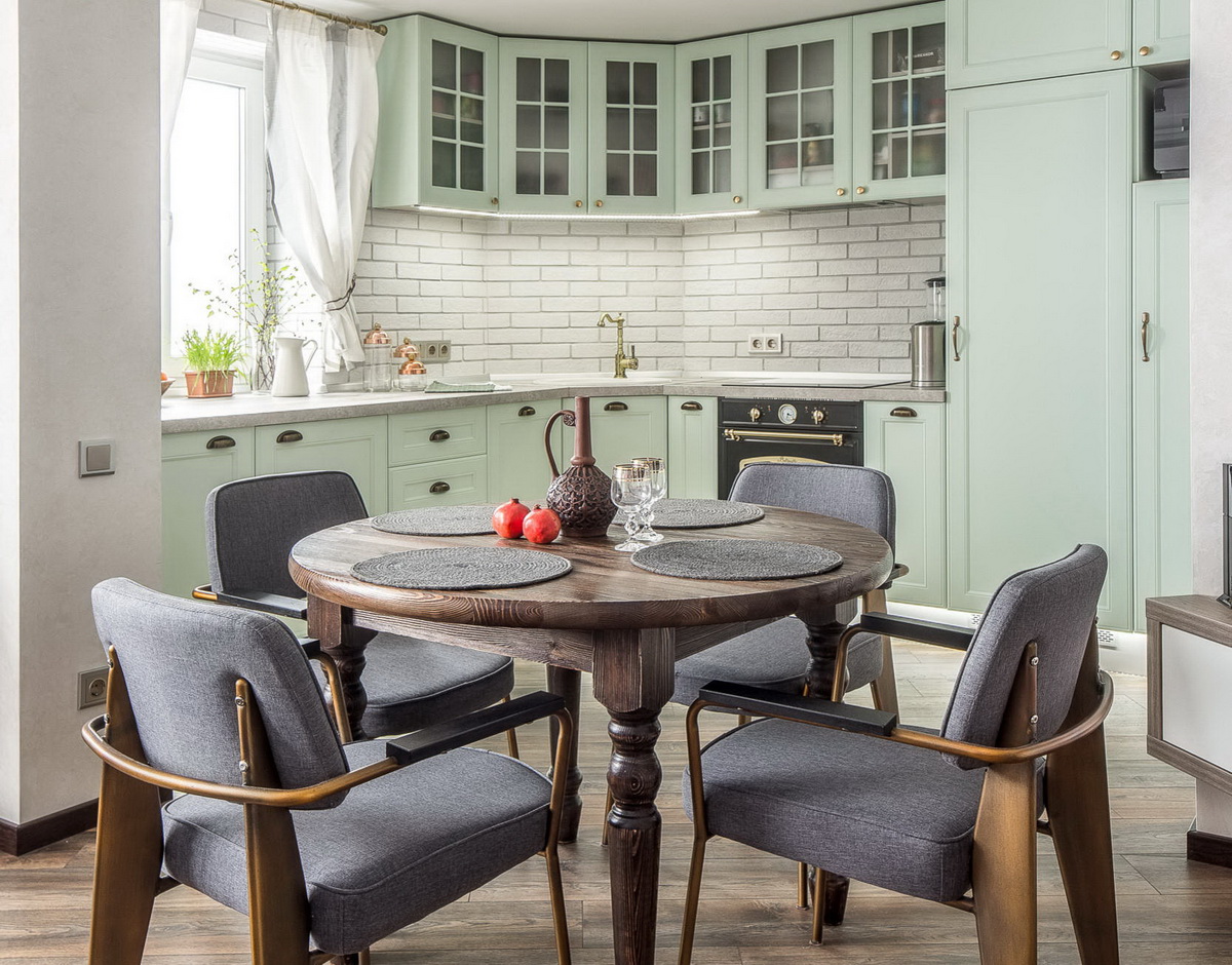 - Внимательно рассмотрите фото помещения для приготовления и приёма еды, убедитесь, что вам подходит мебель. Выберите цвет и материал.