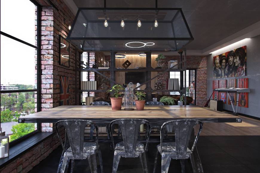 По максимуму применять отделку в индустриальной стилистике: стены из кирпича, бетонные поверхности, выставленные на показ коммуникации.